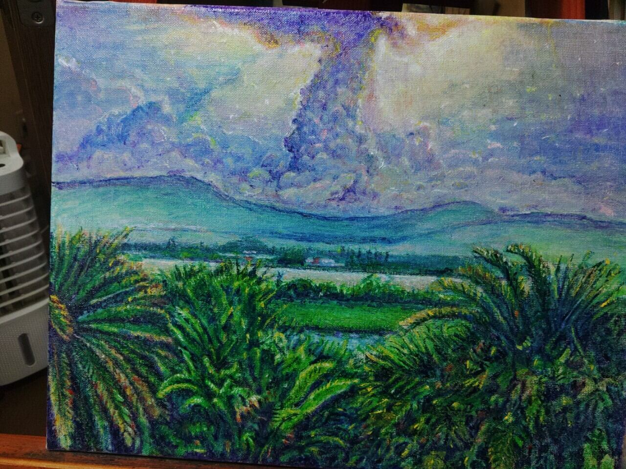 穏やかな雨上がりの午後、透明感あふれる空気の中で未来への明るい予報を感じる美しい風景を、油絵で表現しました。